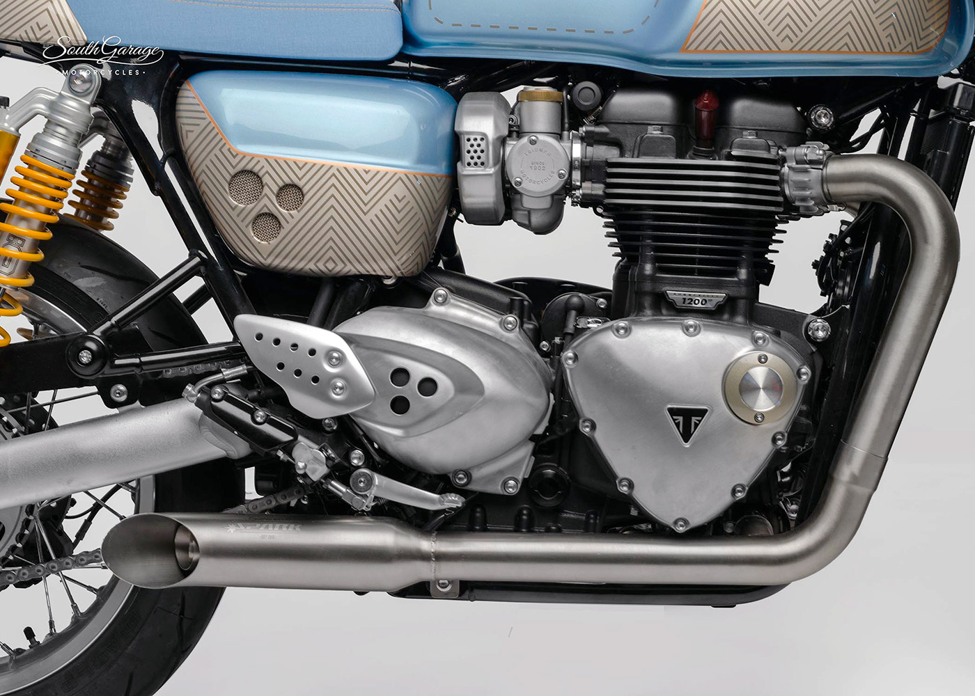 Pensato per i bicilindrici paralleli “high-torque” di Triumph come quelli di Bonneville T120 e Thruxton, in pratica incornicia il propulsore da ogni lato con un andamento pulito e parallelo al telaio, per poi terminare in due canne mozze piuttosto maleducate nell’aspetto.