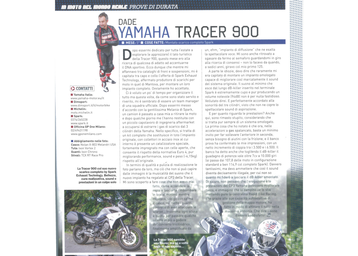 "Dopo essermi dedicato per tutta l’estate esplorare (e apprezzare) il lato turistico della Tracer 900, questo mese ero alla ricerca di qualcosa di adatto ad accentuarne il DNA sportivo. Ecco dunque che mentre mi affannavo tra cataloghi di freni e sospensioni, mi è capitata tra capo e collo l’offerta Spark Exhaust Technology, affermato produttore di scarichi per moto in quel di Mantova, per montare un loro impianto completo. Ovviamente ho accettato.